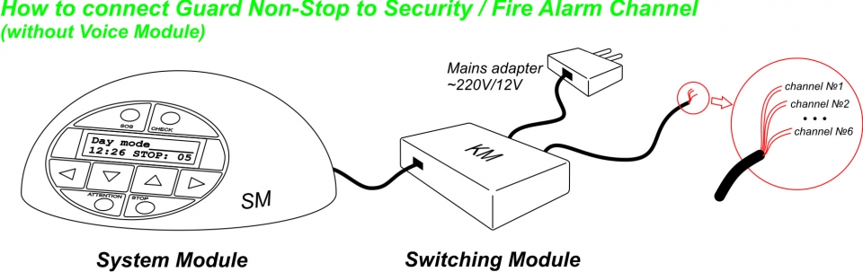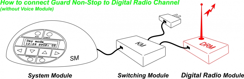 Existing digital radio channel, usually used as alarm buttons for requesting emergency help, could be also used for transmitting alarm messages. As a rule, such transmitters have four input ports that could be connected with appropriate output ports of the Switching Module.