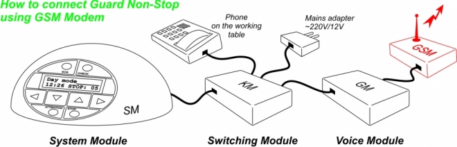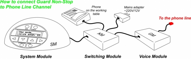 The most typical way is to use the existing analog phone line channels as they are widely available. The phone line is directly connected to VOICE Module that would form and send an appropriate voice message to Operations Desk in case of any default in performance of the security officer.