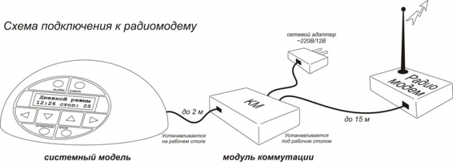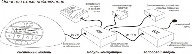 Для простоты инсталляции комплекса, как базовый вариант, выбран телефонный аналоговый канал. Телефонная линия, непосредственно, подключается к голосовому модулю, который в случаях нарушения регламента охранной деятельности формирует и передает контролирующему лицу соответствующие голосовые сообщения.