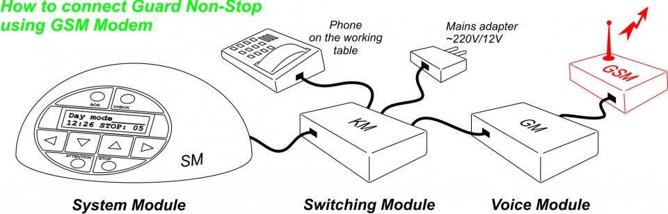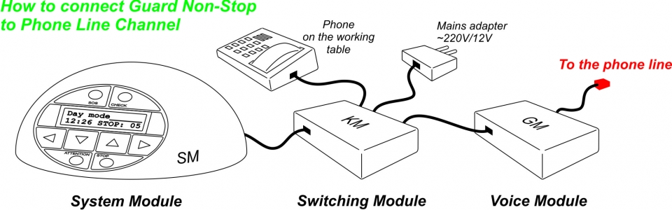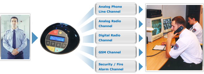 The most typical way is to use the existing analog phone line channels as they are widely available. The phone line is directly connected to VOICE Module that would form and send an appropriate voice message to Operations Desk in case of any default in performance of the security officer.