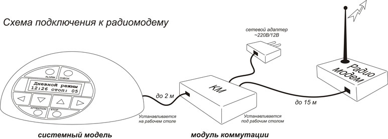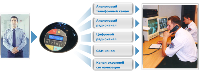 В качестве канала для передачи тревожных сообщений может быть использован цифровой радиоканал, применяемый для тревожной кнопки, которую часто используют для вызова мобильной группы. Такие передатчики имеют, обычно, четыре входа с соответствующей классификацией передаваемых сообщений, которые могут быть подсоединены к соответствующим выходам на коммутационном модуле комплекса.