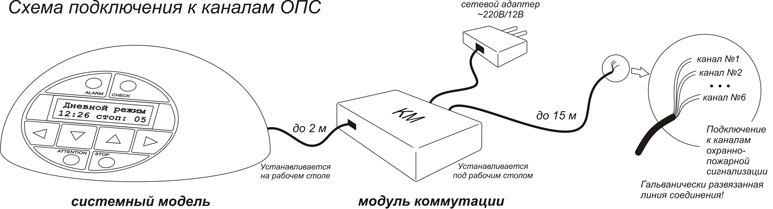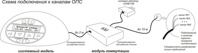 Для простоты инсталляции комплекса, как базовый вариант, выбран телефонный аналоговый канал. Телефонная линия, непосредственно, подключается к голосовому модулю, который в случаях нарушения регламента охранной деятельности формирует и передает контролирующему лицу соответствующие голосовые сообщения.